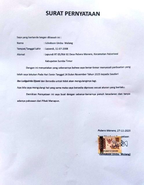 Dalam proses mediasi, Juvekson Umbu Wulang bersedia membuat pernyataan tertulis di atas materai Rp10.000 sebagai bentuk pertanggungjawaban.